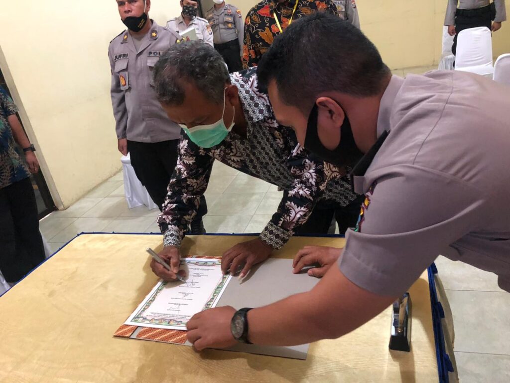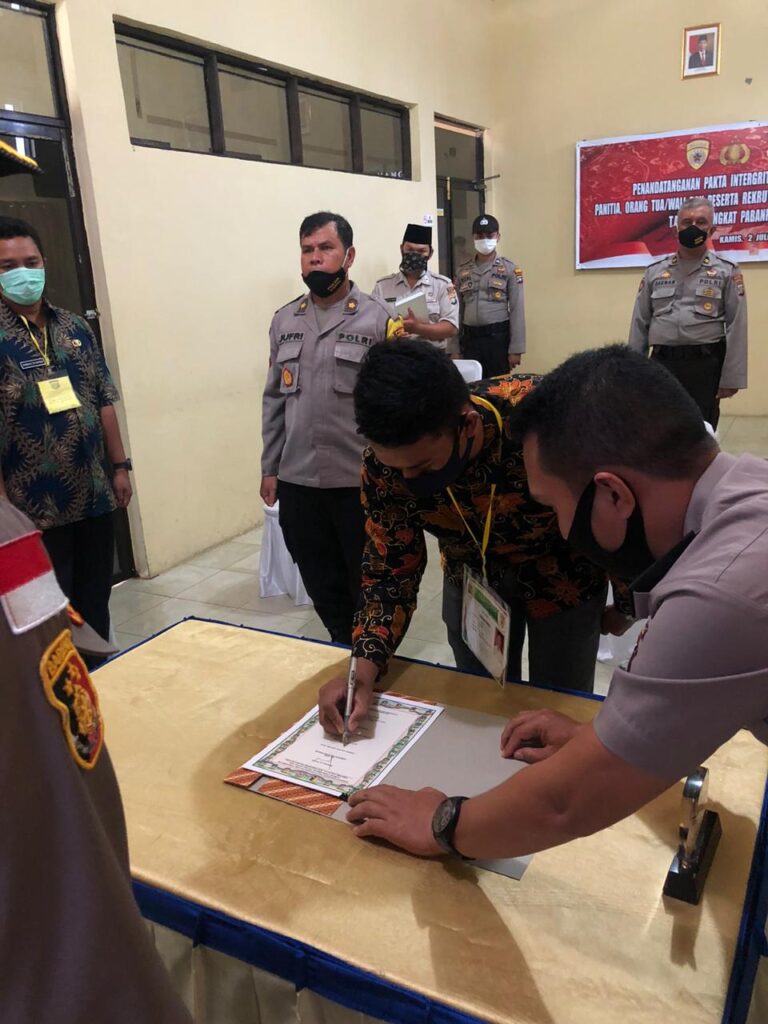 PROBATAM.CO, Natuna – Kapolresta Natuna AKBP Ike Krisnadian didampingi Kabag Sumda Polres Natuna Kompol Zul Jufri, memimpin penandatanganan Pakta Integritas (PI) dan pengambilan sumpah retrutmen Taruna Akpol dan Tantama TA.2020 tingkat Pabanrim Polres Natuna di ruang Vicon, Polres Natuna, Kamis (2/7/2020).