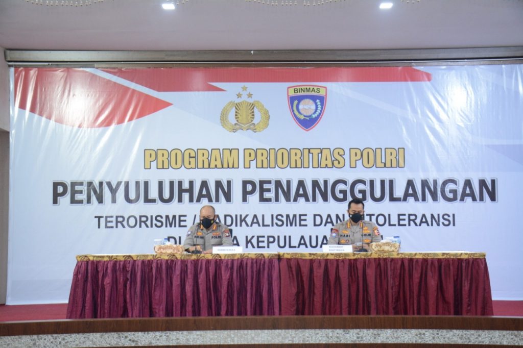 “Kegiatan Penyuluhan Penanggulangan Terorisme, Radikalisme dan Intoleransi Di Gedung Graha Lancang Kuning Polda Kepri dihadiri oleh Dir Binmas Polda Kepri Kombes Pol Rudi Haryanto, S.I.K., Kasubdit Bintibsos Ditbinmas Korbinmas Baharkam Polri Kombes Pol Hari Purnomo, S.I.K,. M.H., beserta staf, Kakanwil Depag Provinsi Kepulauan Riau (diwakili), Ketua Forum Komunikasi Pencegahan Terorisme Provinsi Kepri, Ust. Nasirabas, serta Babinsa, Babin Kamtibmas Dan Tokoh Agama Provinsi Kepri”, ujar Kabid Humas Polda Kepri Kombes Pol Harry Goldenhardt S., S.IK., M.Si.