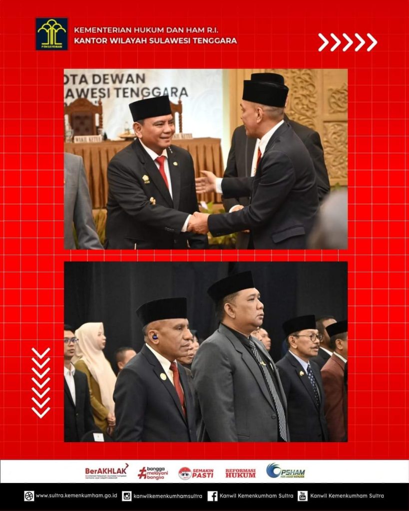 PROBATAM.CO, Kendari – Pejabat (Pj) Gubernur Sulawesi Tenggara Andap Budhi Revianto dan Kepala Kantor Wilayah Kementerian Hukum dan HAM Sulawesi Tenggara Silvester Sili Laba, menyaksikan Pelantikan Anggota Dewan Perwakilan Rakyat Daerah Provinsi Sulawesi Tenggara masa jabatan tahun 2024 – 2029.