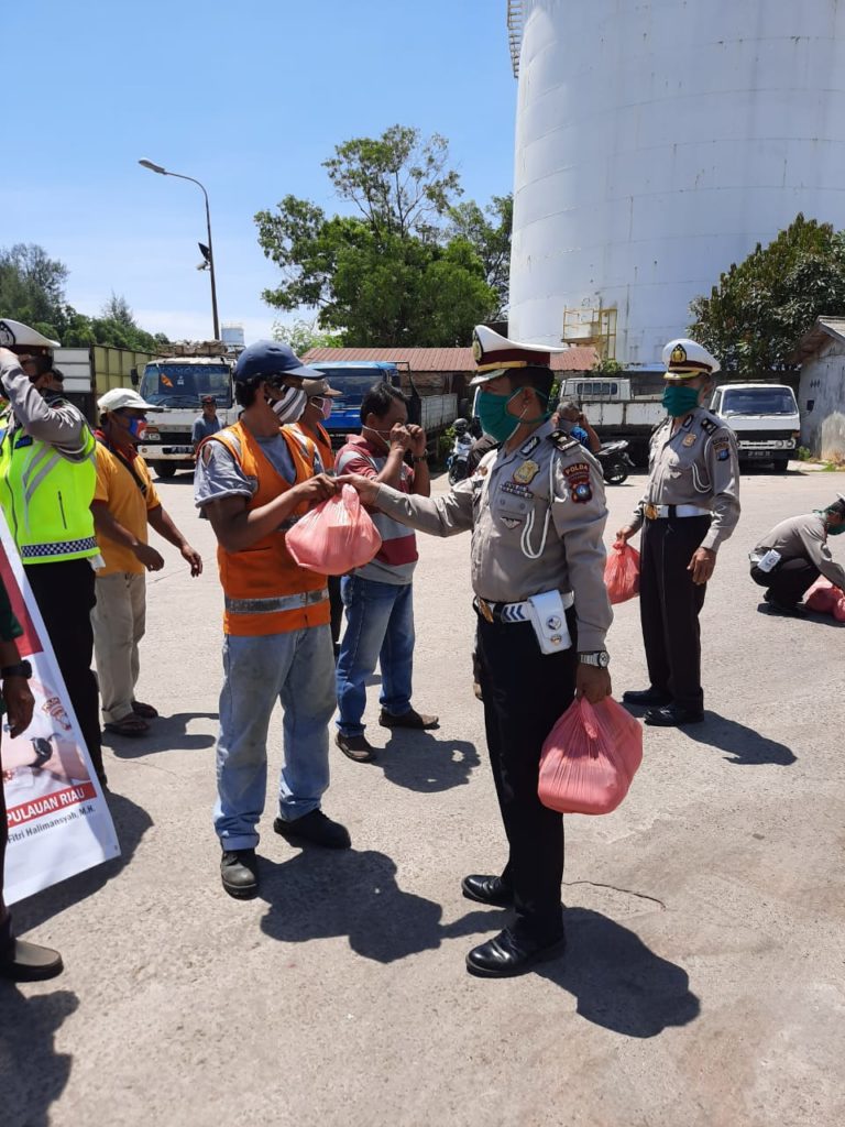 Personel Ditlantas Polda Kepri menyerahkan bantuan kepada masyarakat kurang mampu yang terdampak pandemi Covid-19, Selasa (21/4/2020). (photo:hms)
