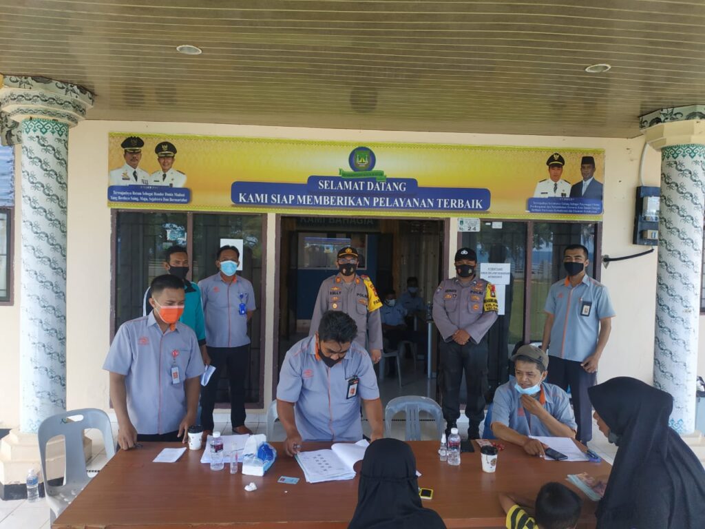 PROBATAM.CO, Batam- Kapolsek Galang AKP Herman Kelly hadir dan memimpin langsung pengamanan bersama personil Polsek Galang daj Satpol PP kecamatan Galang dalam pembagian bantuan sosial tunai (BST) tahap VI di wilayah kecamatan Galang, Kota Batam, Rabu (23/9/2020).