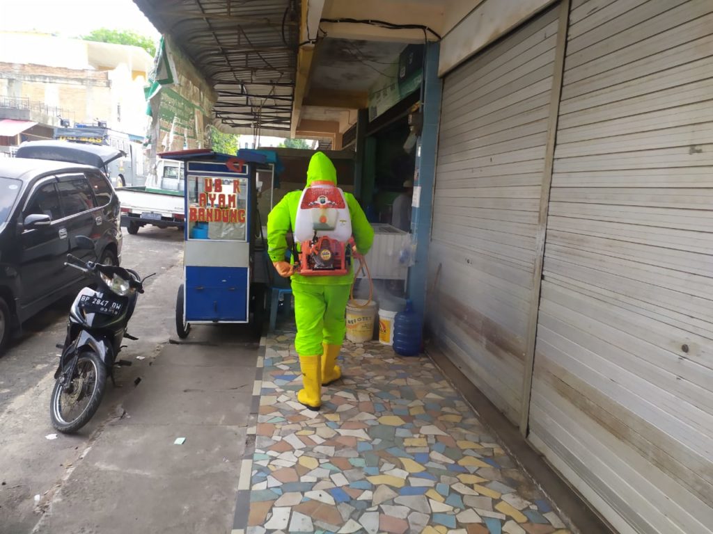 Personil Polresta Barelang melakukan penyemprotan pasar Cahaya Garden dan Pasar Cik Puan, Bengkong, Batam, Rabu (8/4/2020). (Photo:probatam/iin)