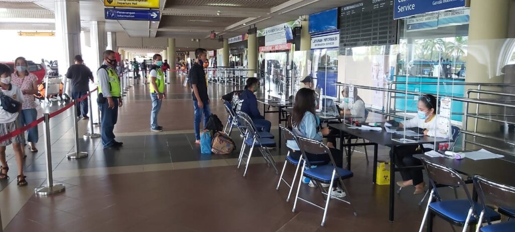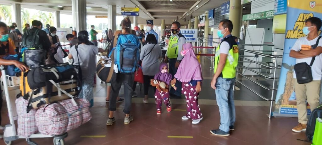 “Kepada penumpang yang sedang mengantri di conter check-in dan penumpang yang sedang menunggu di ruang duduk keberangkatan agar selalu memperhatikan protokol kesehatan seperti menjaga jarak (Physical Distancing), menggunakan masker, dan mencuci tangan pakai sabun dengan air bersih untuk memutus mata rantai dan penyebaran Covid-19,” jelasnya.