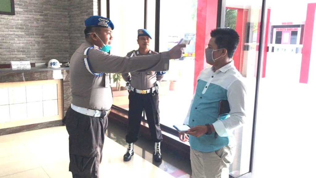 Anggota Provost Polresta Barelang melakukan pemeriksaan suhu terhadap masyarakat atau personil yang masuk ke gedung Utama Polresta Barelang. Usai pemeriksaan suhu dilanjutkan bersihkan tangan dengan hand sanitizer yang sudah tersedia, Selasa (24/3/2020). (photo:probatam.co/iin)