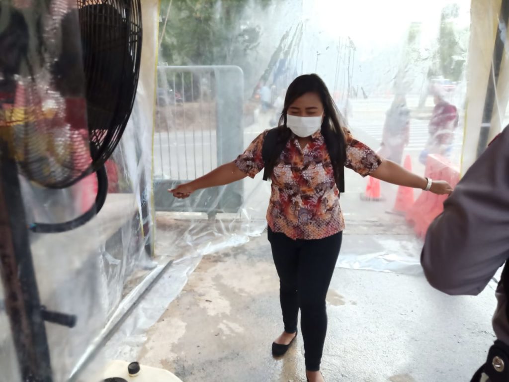 Masyarakat yang masuk ke lingkungan Polresta Barelang masuk tenda khusus dilakukan penyemprotan disinfektan oleh anggota Sabhara Polresta Barelang, Selasa (24/3/2020). (photo:probatam.co/iin)