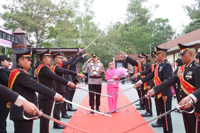 Rangkaian kegiatan ditutup dengan tradisi pelepasan Kombes Pol Zaenal Arifin, S.I.K., beserta Ny. Utie Zaenal melalui prosesi pedang pora, pengalungan bunga, serta iring-iringan pejabat dan personel Polresta Barelang.