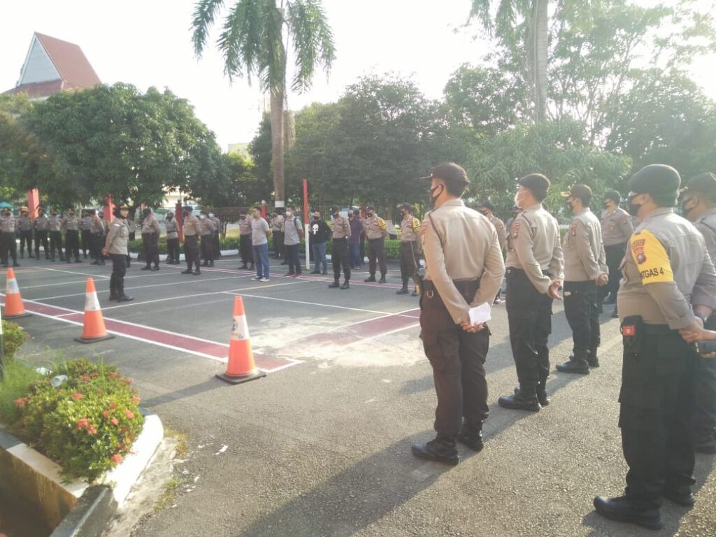Kapolsek Batam Kota AKP Restia Octane Guchi, SE, S.IK, memimpin apel pengamanan Unras dan Mogok Kerja di Kawasan Industri Batam Kota, Batam Selasa (6/10/2020). (Photo:hms)