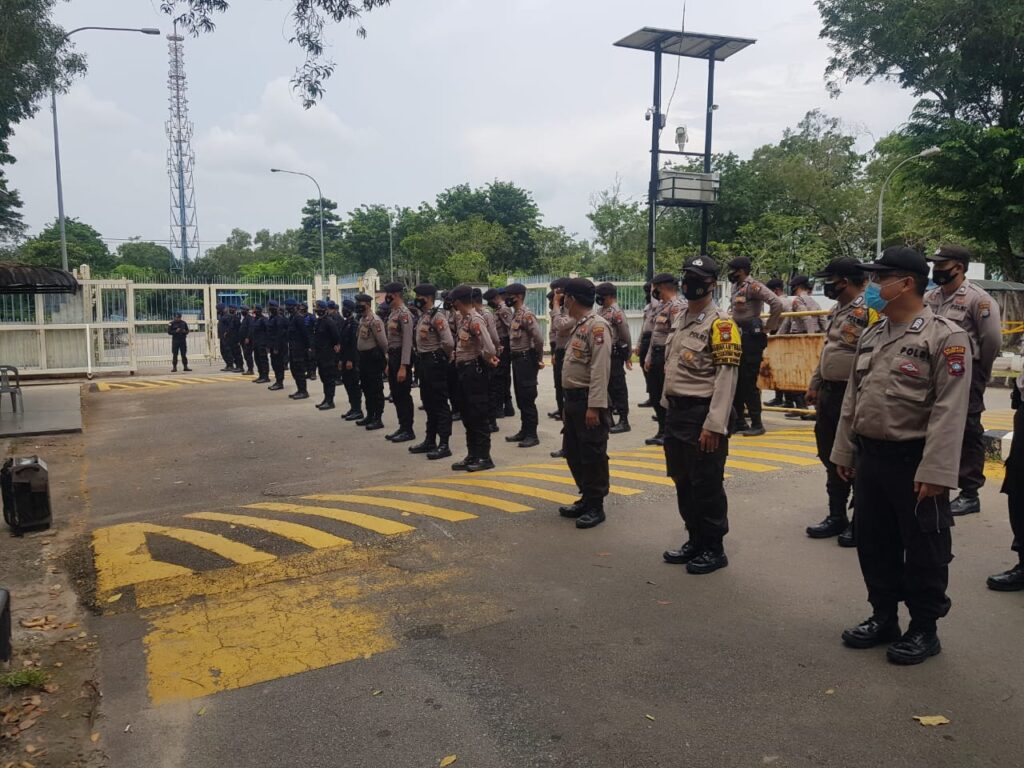 Ratusan Personil Kepolisan Polresta Barelang dan Polda Kepri melaksanakan pengamanan Unras dan Mogok Kerja buruh menolak Ombusman Law RUU Cipta Kerja, Selasa (6/10/2020). (Photo:hms)