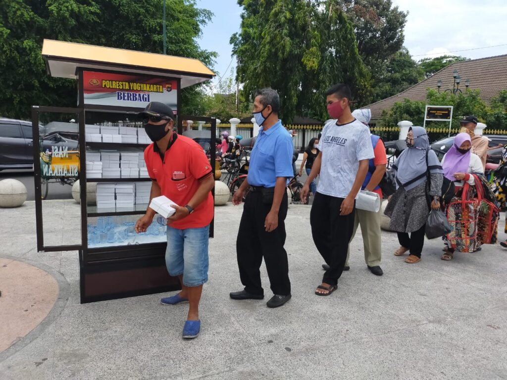 Pembagian ratusan nasi kotak gratis ini, diperuntukan aparat kepolisian setempat untuk masyarakat mulai dari kalangan pengemudi becak, pengemudi andong, pedangan asongan, pedagang kaki lima dan tukamg ojek serta pengunjung di kawasan Malioboro, Kota Yogyakarta, Provinsi DIY yang diletakan di dua lemari pada dua lokasi berbeda.