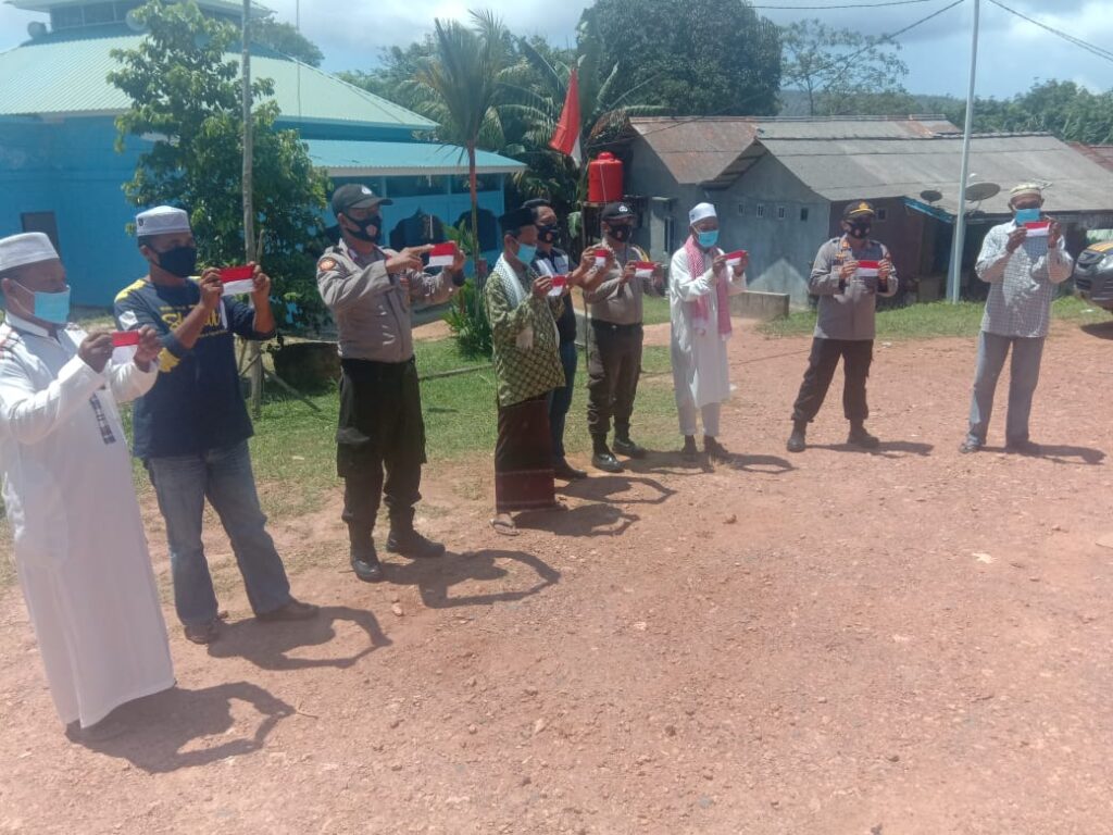 PROBATAM.CO, Batam- Kapolsek Galang AKP Herman Kelly bersama personil Polsek Galang, hari ini, Jumat (7/8/2020), membagi-bagikan bendera merah putih dan masker kepada masyarakat di kecamatan Galang, Kota Batam.
