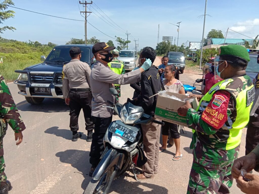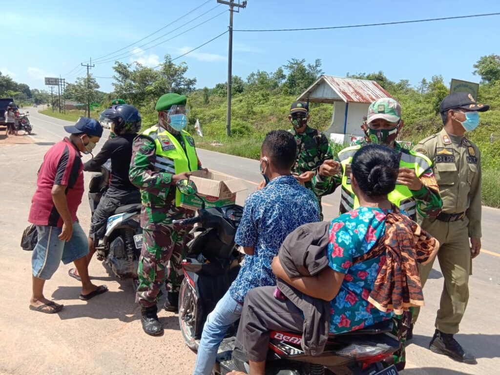 PROBATAM.CO, Batam- Polsek Galang bersama Koramil 04 Galang dan Satpol PP kecamatan Galang membagi-bagikan masker kepada masyarakat di Simpang Sembulang, kecamatan Galang, Kota Batam, Jumat (18/9/2020).