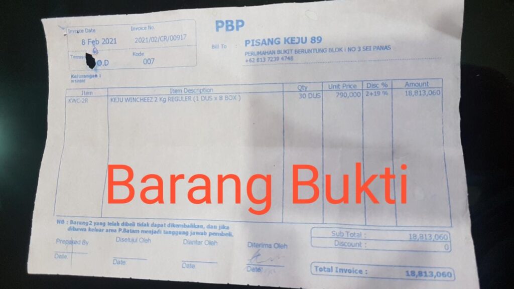 Terdapat barang bukti (BB) yang berhasil di amankan berupa 3 dus Keju merk Wincheez, 1 buah Nota pembelian Keju pada tanggal 8 Februari 2021.