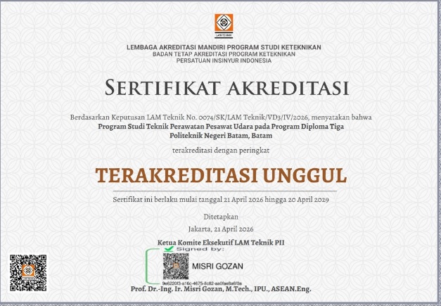 Akreditasi Unggul ini juga semakin memperkuat peran Polibatam dalam mendukung pengembangan sektor Maintenance, Repair, and Overhaul (MRO) di Batam dan wilayah Kepulauan Riau.