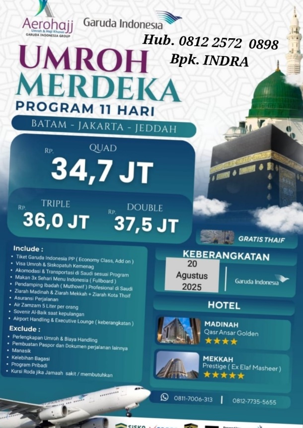 Paket umrah ini dirancang untuk keberangkatan pada tanggal 20 Agustus 2025 dengan durasi 11 hari, melalui rute Batam–Jakarta–Jeddah.