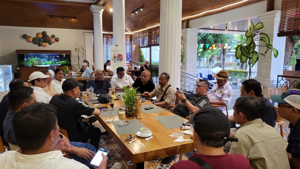 Ketua PWI Kepri Saibansah Dardani ngopi sore dengan Ketua Umum PWI Pusat Akhmad Munir, Sekjen Zulmansyah Sekedang, Ketua DK Atal S Depari dan para Ketua PWI se-Indonesia seusai Pelantikan Pengurus PWI Pusat di Monumen Pers Surakarta, Sabtu 4 Oktober 2025. (Foto: dok/pwi)