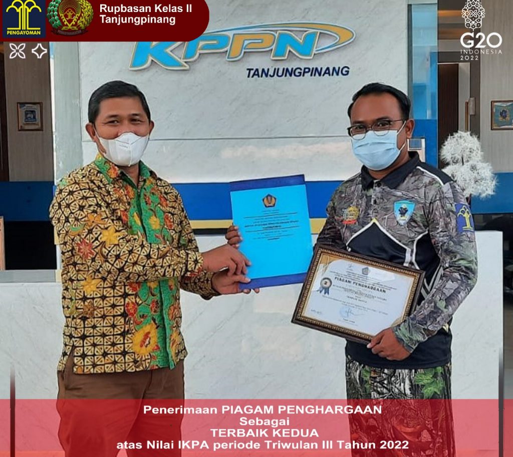 PROBATAM.CO, Tanjungpinang– Rupbasan Kelas II Tanjungpinang mendapatkan penghargaan dari Kantor Pelayanan Perbendaharaan Negara (KPPN) Tanjungpinang sebagai Terbaik Kedua Satuan Kerja Berprestasi atas Nilai IKPA Kategori Pagu Kecil (<5 milyar) periode Triwulan III Tahun 2022, Jumat (19/11/2022).