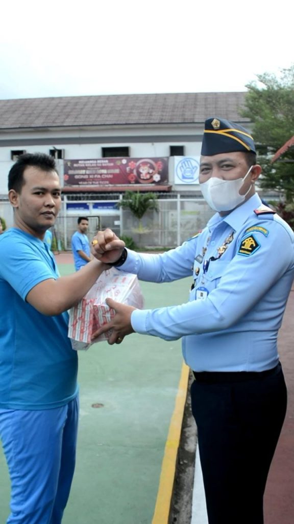 Karutan Kelas IIA Batam, Yan Patmos bersama jajarannya membagikan perlengkapan mandi dan multivitamin tersebut secara langsung kepada masing masing perwakilan kamar di lapangan Rutan Batam.