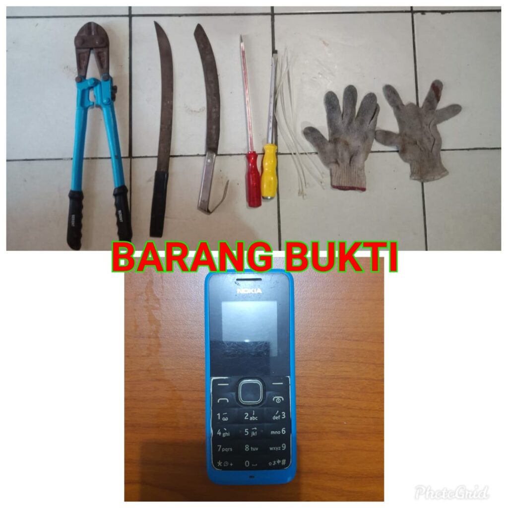 “Sedangkan Barang Bukti yang di amankan, 1 (Satu) Unit Handphone Nokia Senter (Milik Korban), 1 (Satu) Buah Pemotong/Gunting Besi, 2 (Dua) Buah Parang, 2 (Dua) Buah Obeng, 4 (Enam) Buah Kabel Tie, 1 (Satu) Pasang Sarung Tangan,” paparnya.