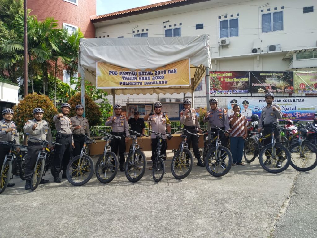 PROBATAM.CO, Batam – Personil Satuan Sabhara Polresta Barelang patroli bersepeda menyambangi gereja dalam rangka operasi lilin seligi 2019, Minggu (29/12).