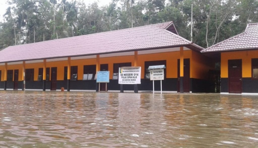 Sekolah yang terendam itu terlihat di Kecamatan Inuman. Di wilayah ini banjir merendam Sekolah Dasar Negeri 014 Pulau Sipan Hilir. Ketinggian air diperkirakan mencapai 20 sentimeter.