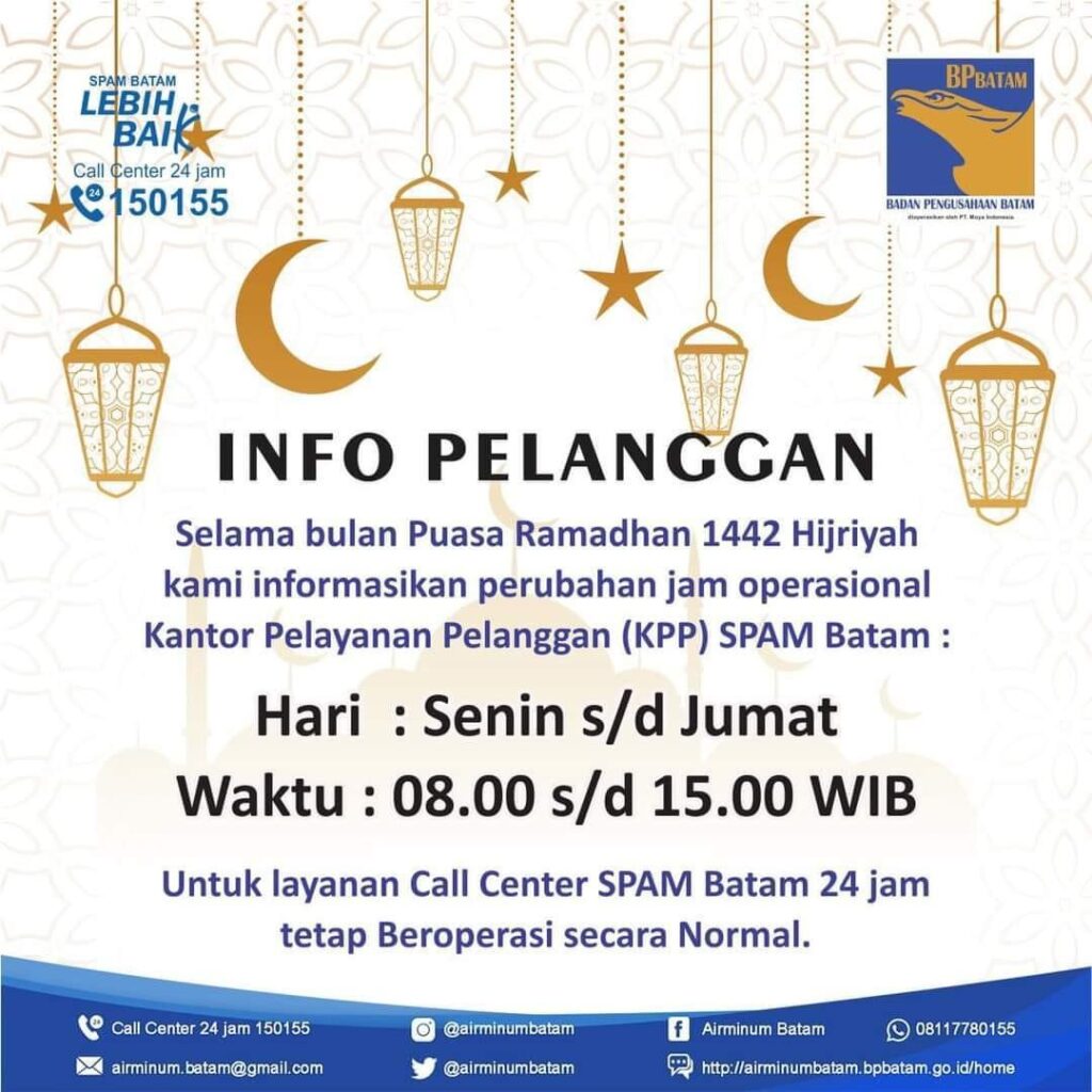 PROBATAM.CO, Batam- Sehubungan dengan pelaksanaan Ibadah Puasa Ramadhan 1442 Hijriah, disampaikan perubahan jam operasional Kantor Pelayanan Pelanggan (KPP) SPAM Batam, di Kota Batam.