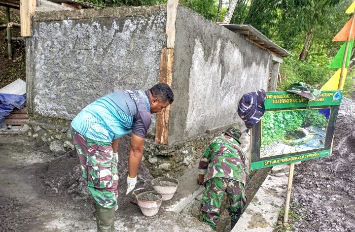 Dengan tangan berbalut adonan semen, para prajurit tak bekerja sendiri. Warga turut membantu, seolah setiap ayunan cetok menjadi bahasa kebersamaan yang tak perlu diterjemahkan.