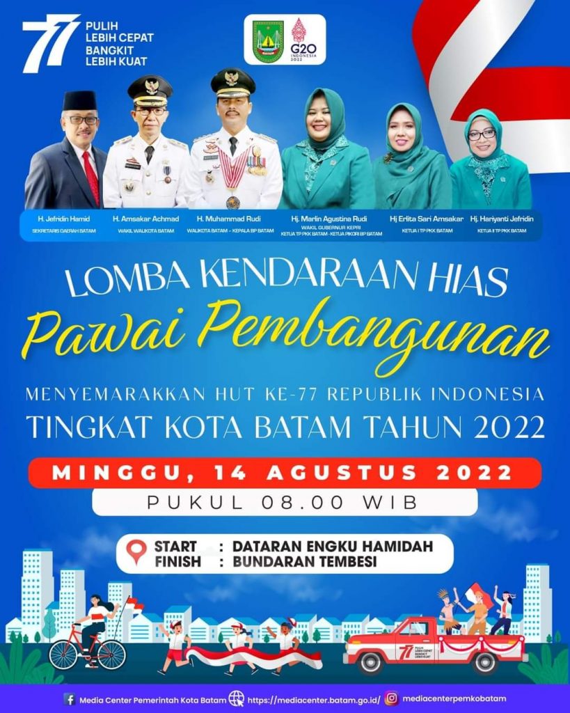 PROBATAM.CO, Batam – Pemko Batam menggelar lomba kendaraan hias pawai pembangunan, dalam rangka menyemarakan Hari Ulang Tahun (HUT) ke 77 Kemerdekaan Republik Indonesia.