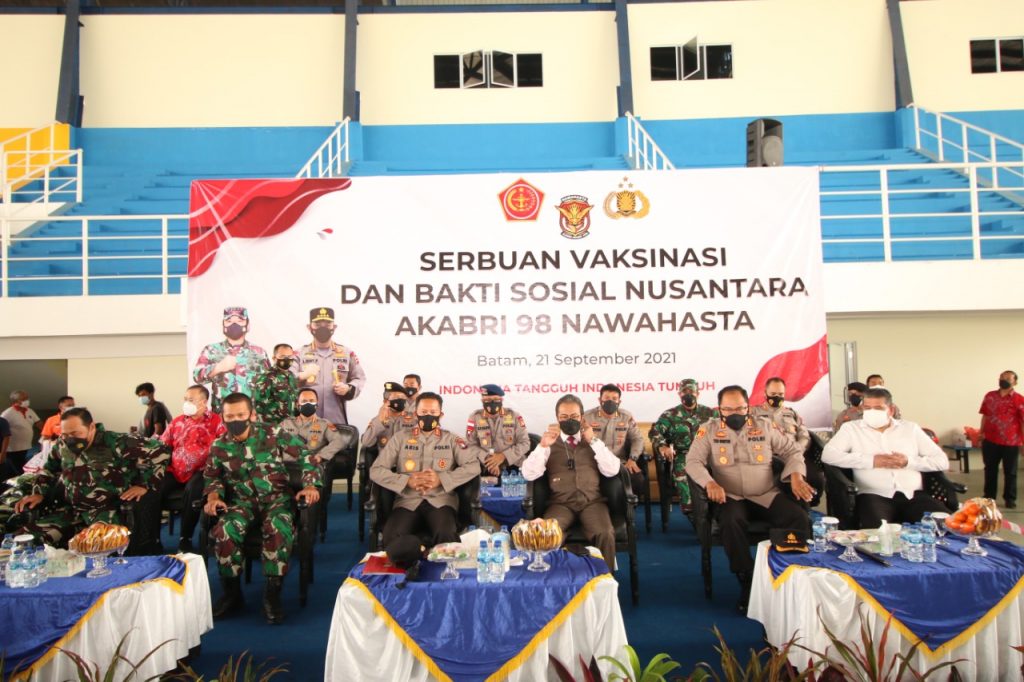 PROBATAM.CO, Batam – Kapolda Kepri Irjen. Pol. Dr. Aris Budiman, M.Si menghadiri kegiatan Serbuan Vaksinasi dan Bakti Sosial yang diselenggarakan oleh Alumni AKABRI 1998 Nawahasta bertempat di Sport Hall Universitas Batam, Selasa (21/09/2021)