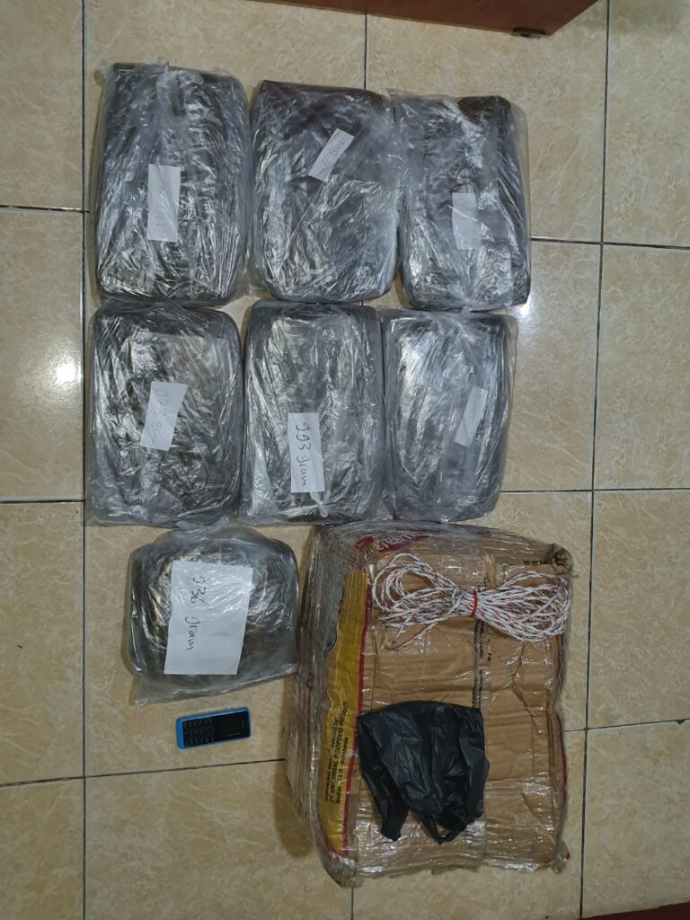 “Daun Ganja sebanyak 7 bungkus plastik putih dengan berat total sebanyak 6,8 kg dan tersangka saat ini masih dikembangkan,” tutupnya.(zel)