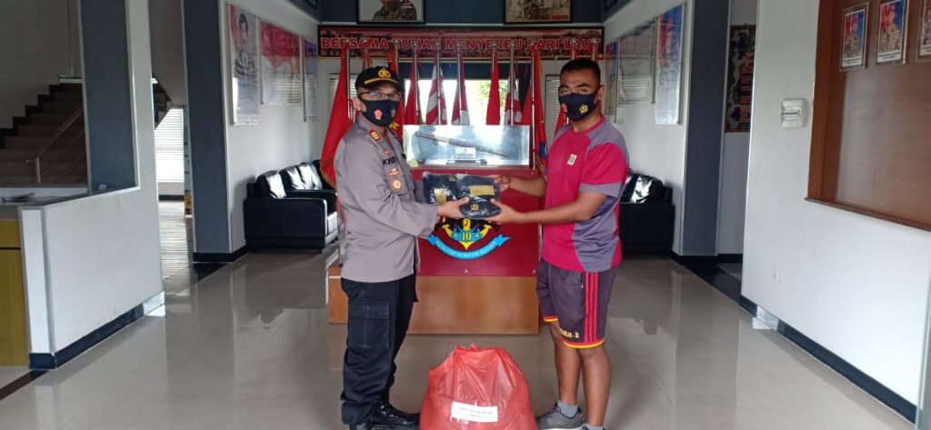 PROBATAM.CO, Batam- Polresta Barelang membagikan ribuan pcs masker untuk personil Yonif Marinir 10/SBY di Mako Yonif Marinir 10/SBY, Pulau Setokok, Batam, Selasa (4/8/2020).