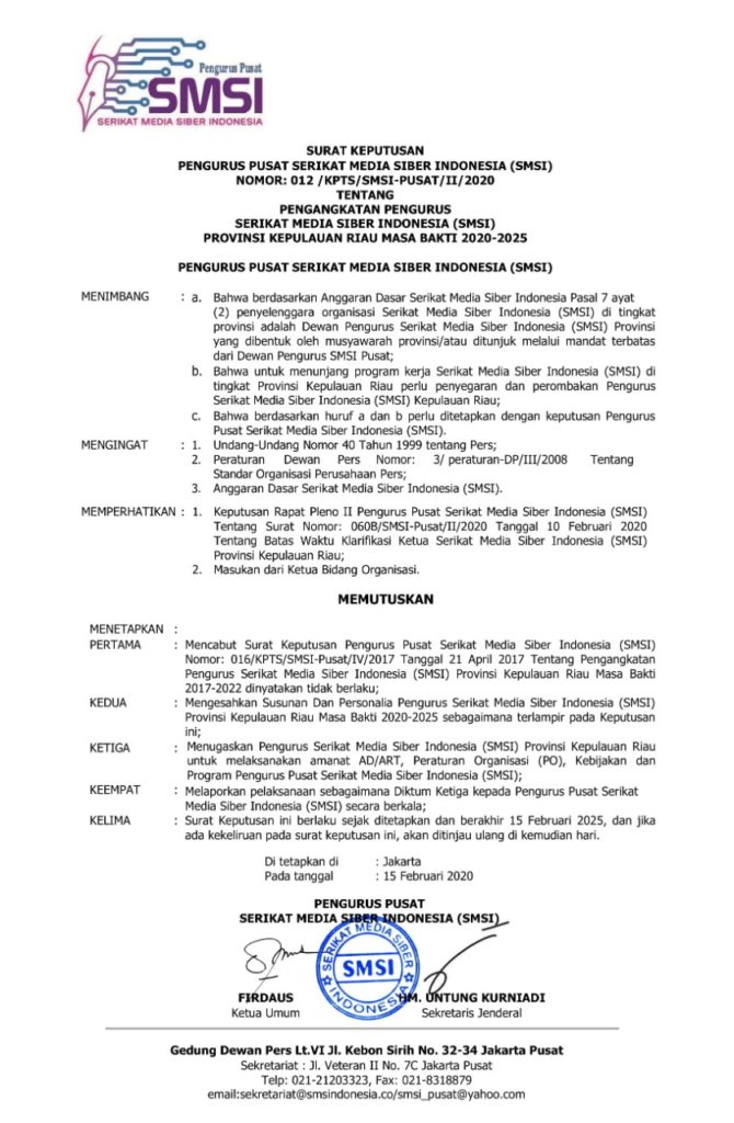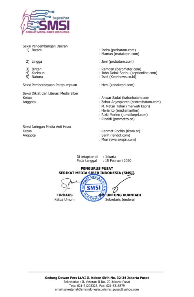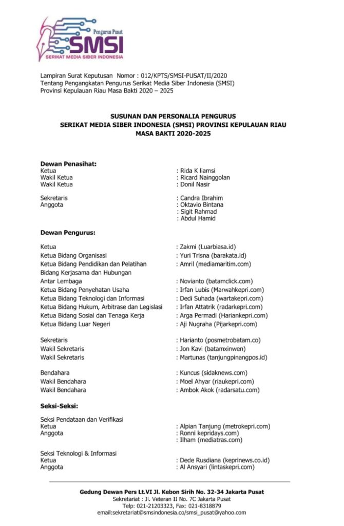 PROBATAM. CO, JAKARTA – Susunan Kepengurusan dan Personalia Serikat Media Siber Indonesia (SMSI) Cabang Kepulauan Riau (Kepri) masa bakti 2020 – 2025, telah ditetapkan oleh Pengurus SMSI Pusat, yang ditandatangin Ketua Umum SPSI Pusat Firdaus dan Sekretaris Jenderal SMSI Pusat HM Untung Kurniadi, SK No. 12/KPTS/SMSI-Pusat/II/2020, tanggal 15 Februari 2020 lalu.