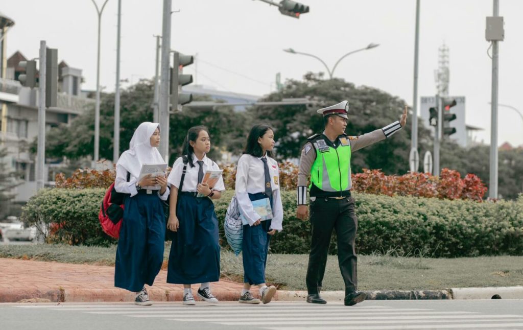 Salah satu anggota Satlantas Polresta Barelang, Bripka Ilham Abduh terlihat sedang membantu anak sekolah yang hendak menyeberang di jalan.