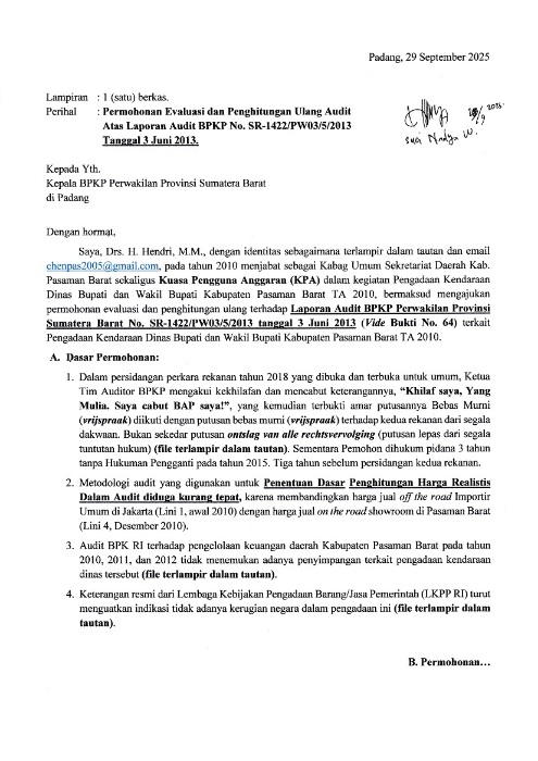 PROBATAM.CO, PADANG – Surat Permohonan Audit Ulang (SPAU), atas kasus Mantan Pejabat Kabupaten Pasaman Barat, Drs, H. Hendri MM, sudah diterima oleh Badan Pengawasan Keuangan dan Pembangunan (BPKP), Perwakilan Provinsi Sumatera Barat, Senin (29/09/2025).