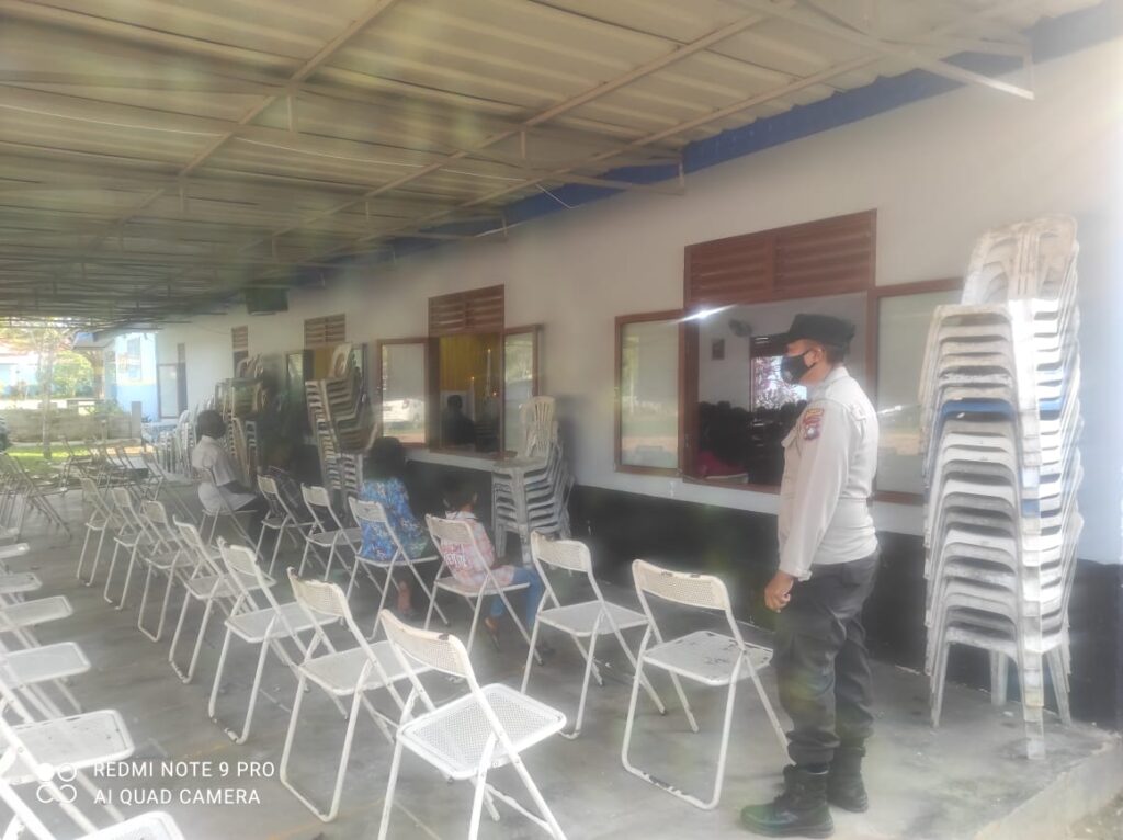 PROBATAM.CO, Batam- Personil Polsek Galang melaksanan pengamanan (pam) kegiatan ibadah mingguan di gereja ST. Ignatius Loyola Sei Raya, Galang, Kota Batam, Minggu (11/4/2021).