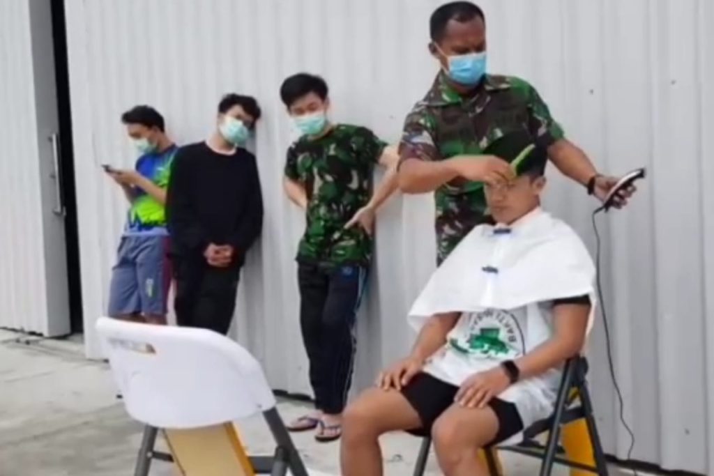 Personil Paskhas TNI AU sedang memangkas rambut WNI yang jalani Observasi di Natuna. (photo:probatam/hai)