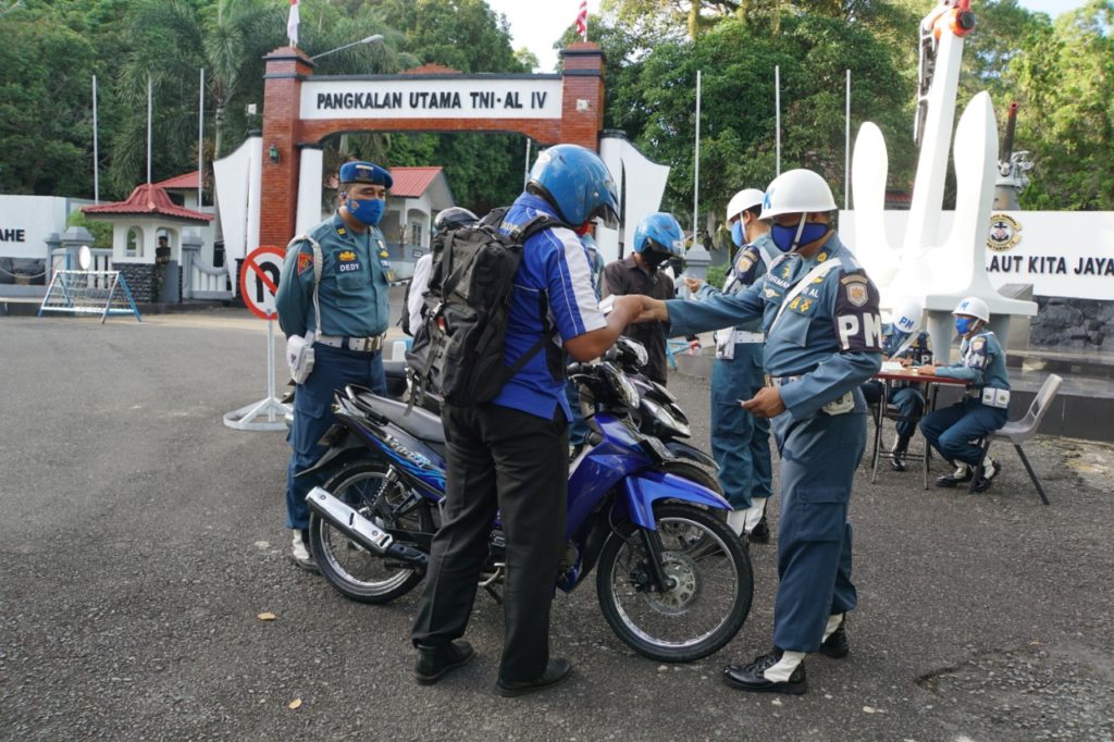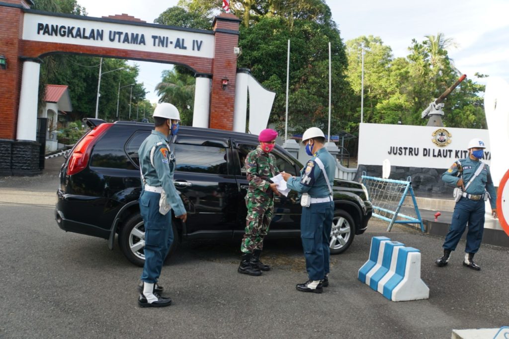 PROBATAM.CO, Batam – Polisi Militer Lantamal IV Tanjungpinang mengelar Operasi Penegakan dan Ketertiban(Gaktib) rutin TW II TA.2020 dengan sandi “Waspada Wira Pari” yang dipimpin Kasi Gakkum Pomal Lantamal IV Mayor Laut (PM) Anggiat Napitupulu di depan Pintu masuk Gerbang Pos I Mako Lantamal IV Jalan Yos Sudarso No.1 Batu Hitam, Tanjungpinang, Kepulauan Riau (Kepri), Selasa (2/6/2020).