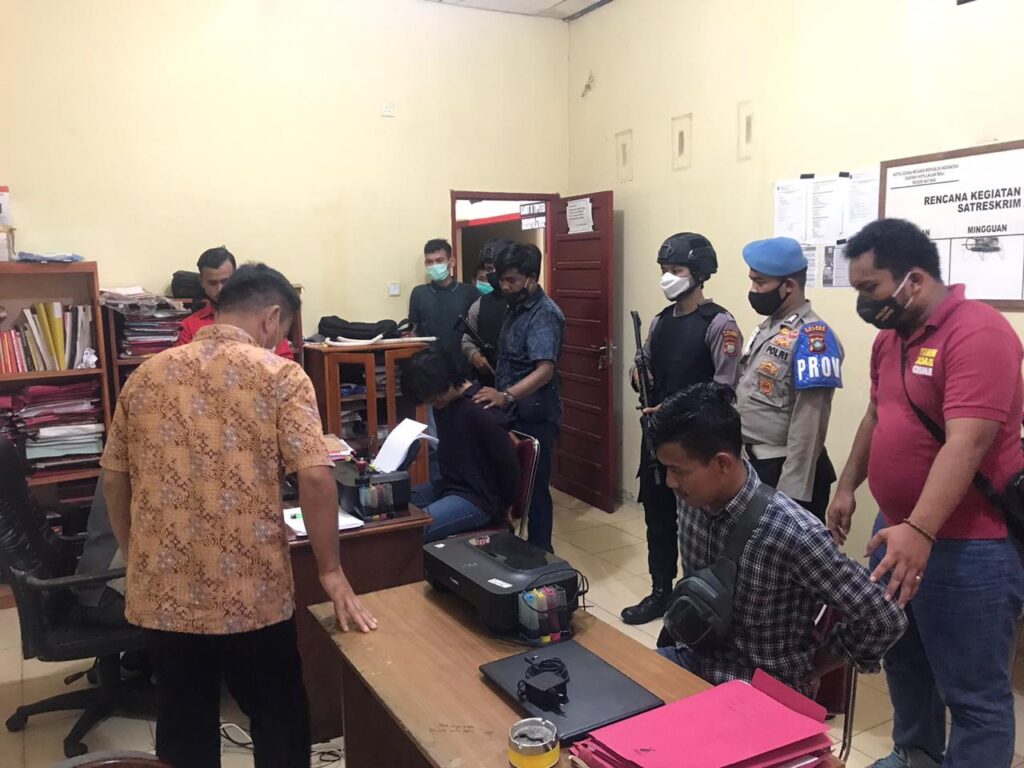 Tidak lama kemudian piket fungsi Sat Reskrim dan Sat Intelkam keluar dari ruang SPKT dan berlari ke arah TKP lalu memborgol dan memeriksa isi tas yg dibawa oleh Pelaku. Selanjutnya Pelaku yang telah diamankan di TKP oleh piket siaga Reskrim digiring menuju ruang pemeriksaan Sat Reskrim.