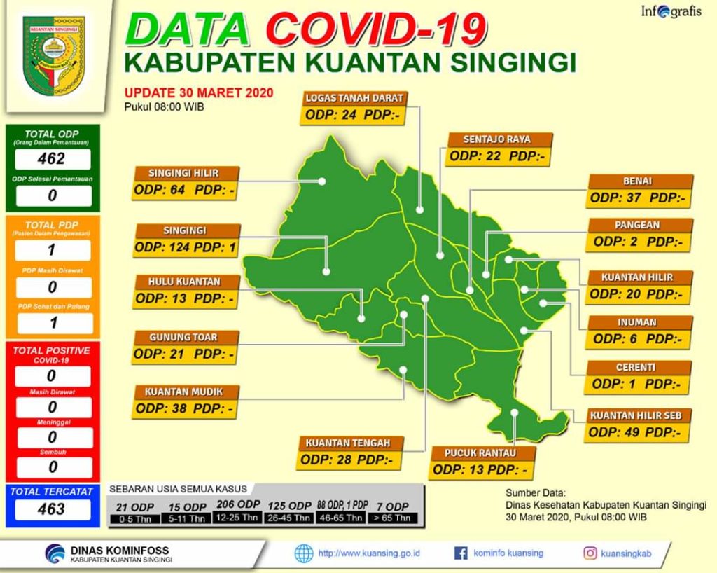 Dinas Kesehatan Kuansing juga mengimformasikan jumlah orang yang masih dalam pengawasan alias ODP. Sebanyak 462 Orang Dalam Pengawasan (ODP). Data sebanyak ini tersebar hampir di seluruh wilayah dikecamatan.