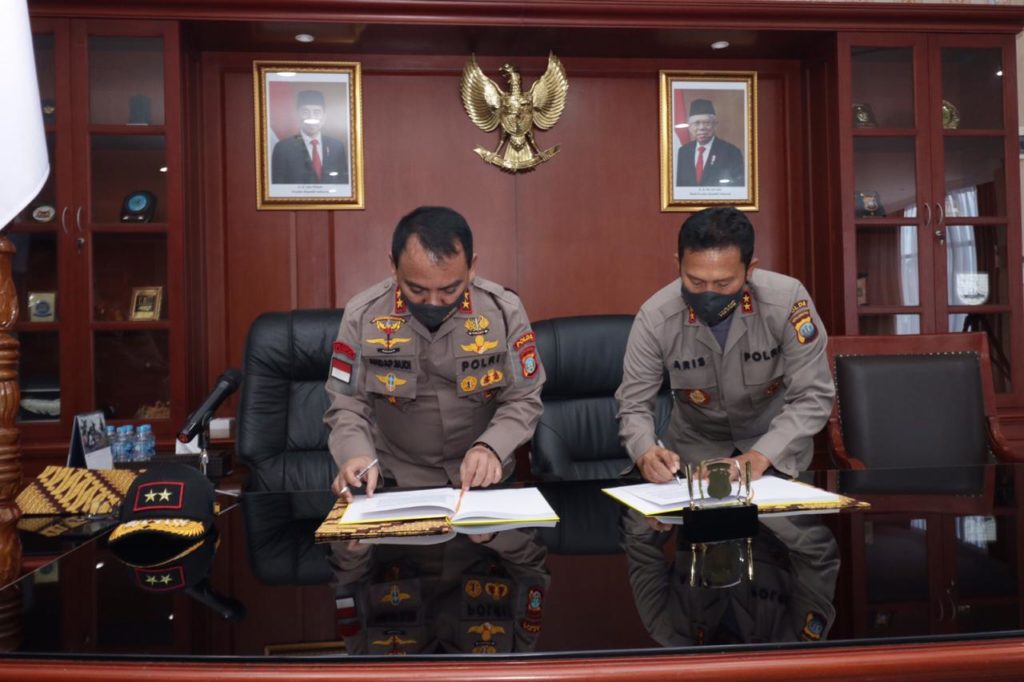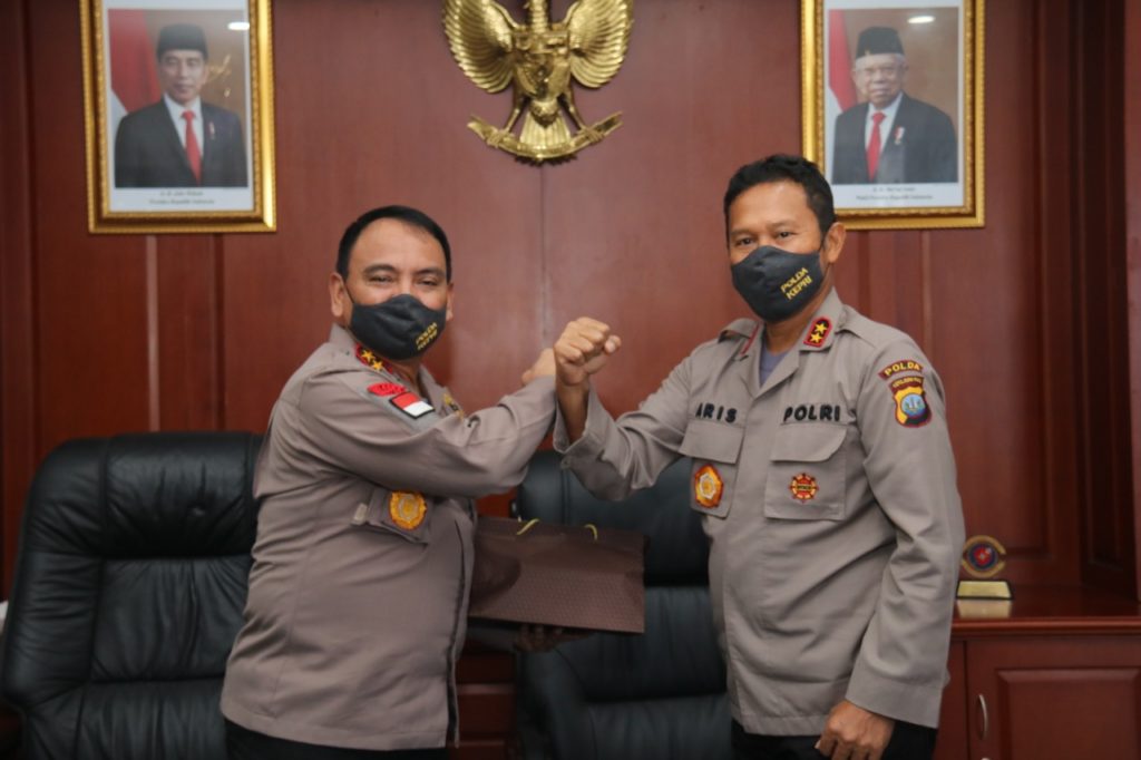 PROBATAM.CO, Batam –Kapolda Kepri ke 12 Irjen Pol Andap Budhi Revianto, MH yang kini menjabat Irjen Kemenkumham RI itu resmi menyerahkan pataka Polda Kepri Seligi Sakti Marwah Negeri kepada pengantinya, Irjen Pol Aris Budiman, di ruang Kerja utama Kapolda Kepri, Senin (11/5/2020) pagi.