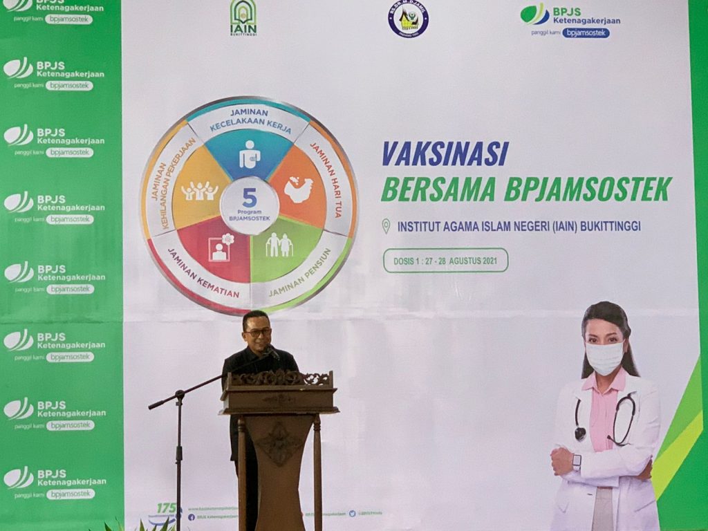 Deputi Direktur Wilayah Sumbarriau Pepen S Almas bersama dengan Pelaksana Tugas (Plt) Gubernur Sumatera Barat yang diwakili oleh Kepala Dinas Tenaga Kerja dan Transmigrasi Provinsi Sumatera Barat Nazrizal, S.Sos, M.Si , Walikota Bukittinggi yang diwakili oleh Wakil Walikota Bukittinggi,H. Marfendi gelar Datuak Basa Balimo, Bupati Agam Dr. H. Andri Warman, S.Sos., M.M, Rektor IAIN Dr. Ridha Ahida, M.Hum, Direktur RSUP Dr. M. Jamil yg diwakili Dr. dr. Dovy Djanas, Sp. OG., Kepala Kantor Cabang BPJAMSOSTEK di Wilayah SumbarRiau Kepri beserta Jajarannya meninjau langsung proses vaksinasi tahap pertama di Kampus IAIN Bukitiinggi, Jumat (27/8).