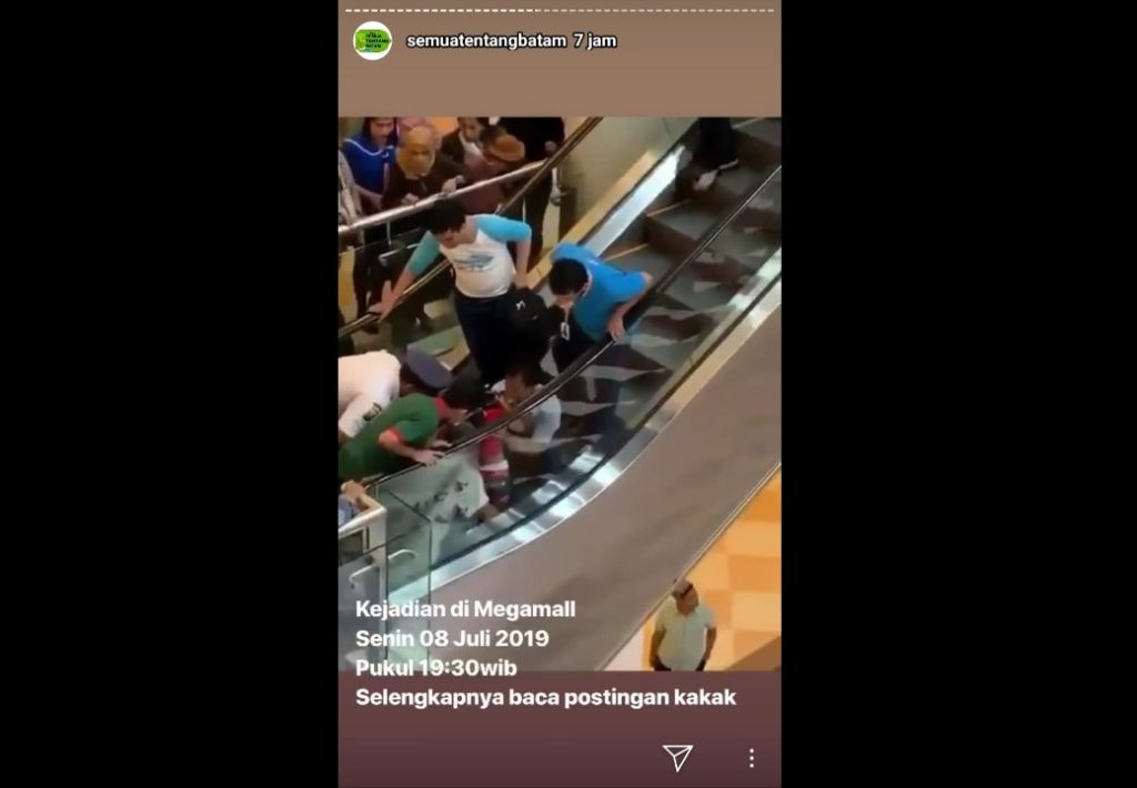Dalam postingan itu juga dijelaskan kejadian tersebut terjadi pada hari Senin, 8 Juli 2019 sekitar pukul 19.30 WIB. Penyebabnya disebutkan karena si anak bermain di sekitar eskalator dan tak tahu menginjak garis kuning.
