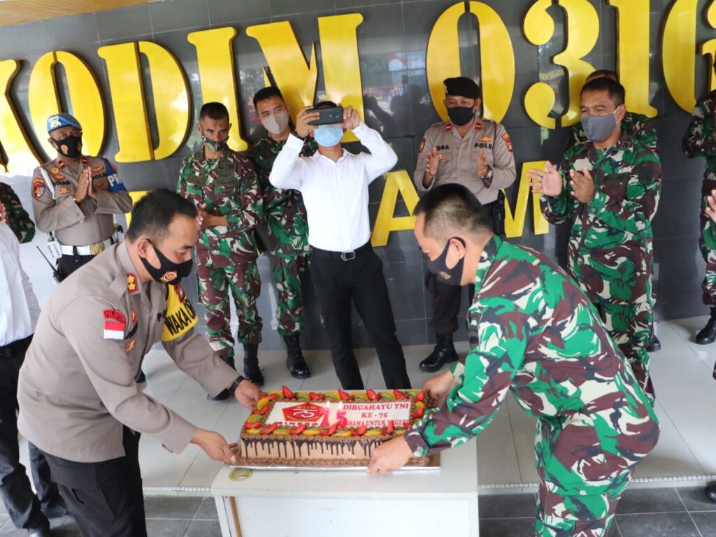 Wakapolresta Barelang AKBP Junoto, S.IK bersama PJU poto bersama dengan Kasdim 0316/Batam Mayor TNI Arh Alexander Achmad, usai hantarkan kue Ulang Tahun di HUT TNI ke 75. (Photo:hms)