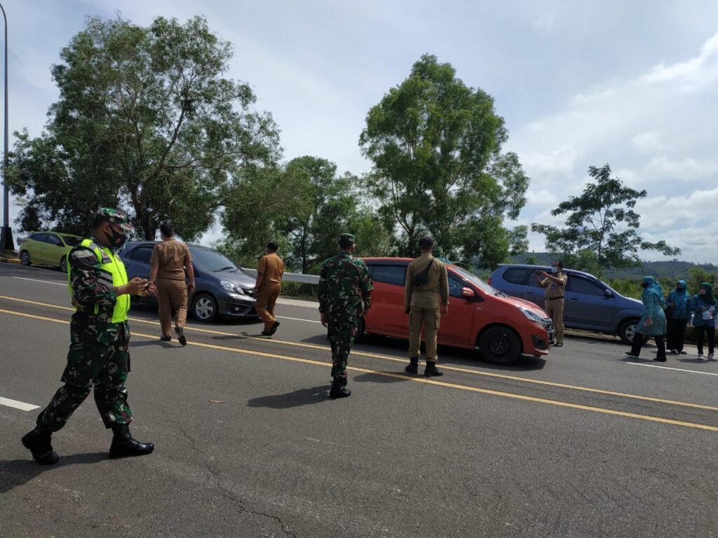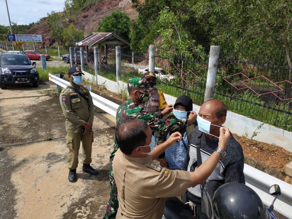 PROBATAM.CO, Batam – Kapolsek Galang AKP Herman Kelly bersama Camat Galang Ute Rambe dan Danramil Galang Kapten Inf Janawar membagikan masker di jembatan V, Kelurahan Sijantung, Kecamatan Galang, Kota Batam, Selasa (10/11/2020) pukul 11.00 WIB.