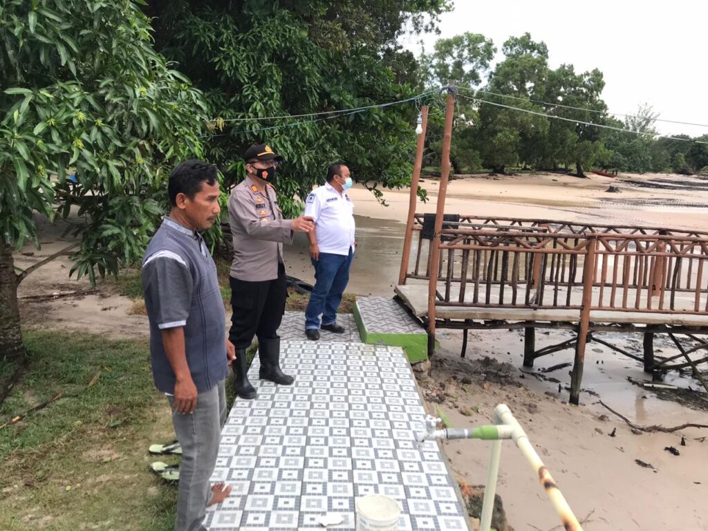 Kapolsek Galang AKP Herman Kelly meninjau dan memberikan bantuan kepada Yayasan An Nur Pantai Kelue Galang yang terkena gelombang air pasang, Sabtu (2/1/2020). (Photo: dok/polsek)